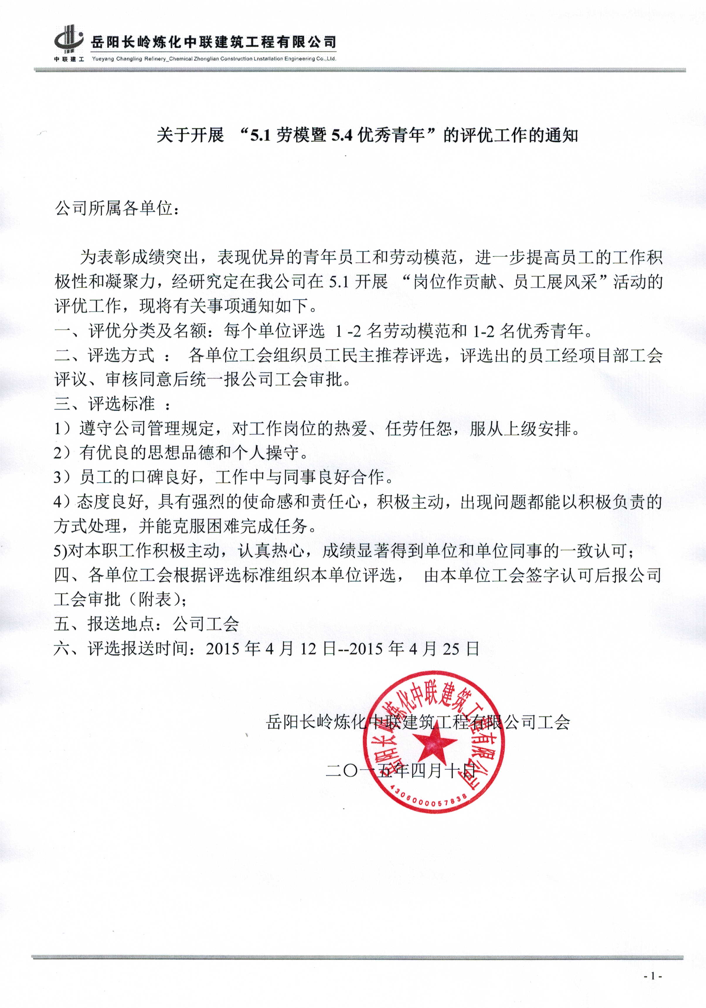 關(guān)于開(kāi)展“5.1勞模暨5.4優(yōu)秀青年”的評(píng)優(yōu)通知